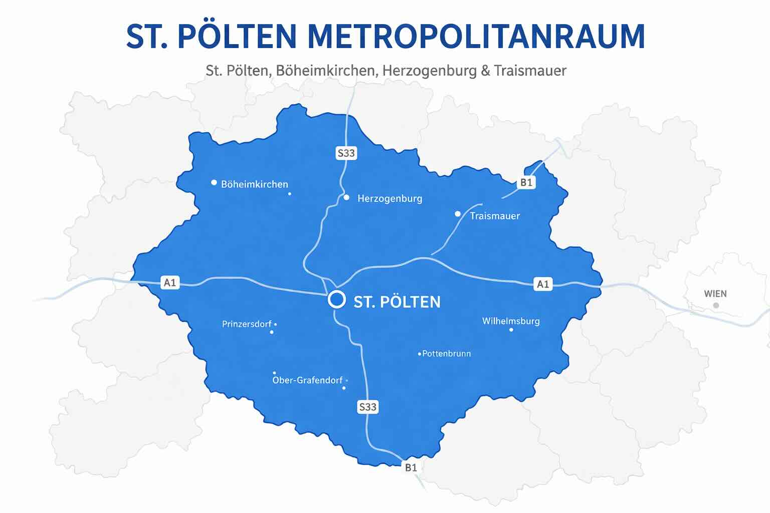 Außerhalb der Kernstadt verschiebt sich die Logik. Zwischen St. Pölten und dem direkten Umland in Richtung Wilhelmsburg, Herzogenburg oder Neulengbach spielen häufiger längere Leitungswege, Übergänge zwischen Haus und Anschluss, Außenbereiche, Kellerabläufe oder ältere Leitungsabschnitte eine Rolle.